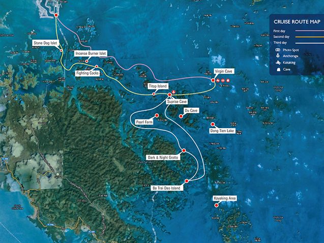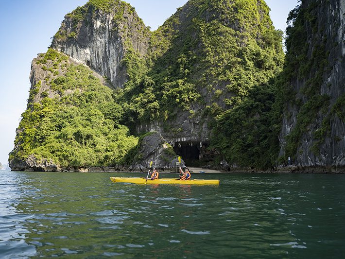 - Transfer by tender to the cave area. Kayak through ancient limestone formations, walk through Trinh Nu Cave, and relax on the stunning Trinh Nu Beach - known for its white sand and emerald waters.